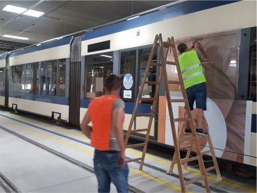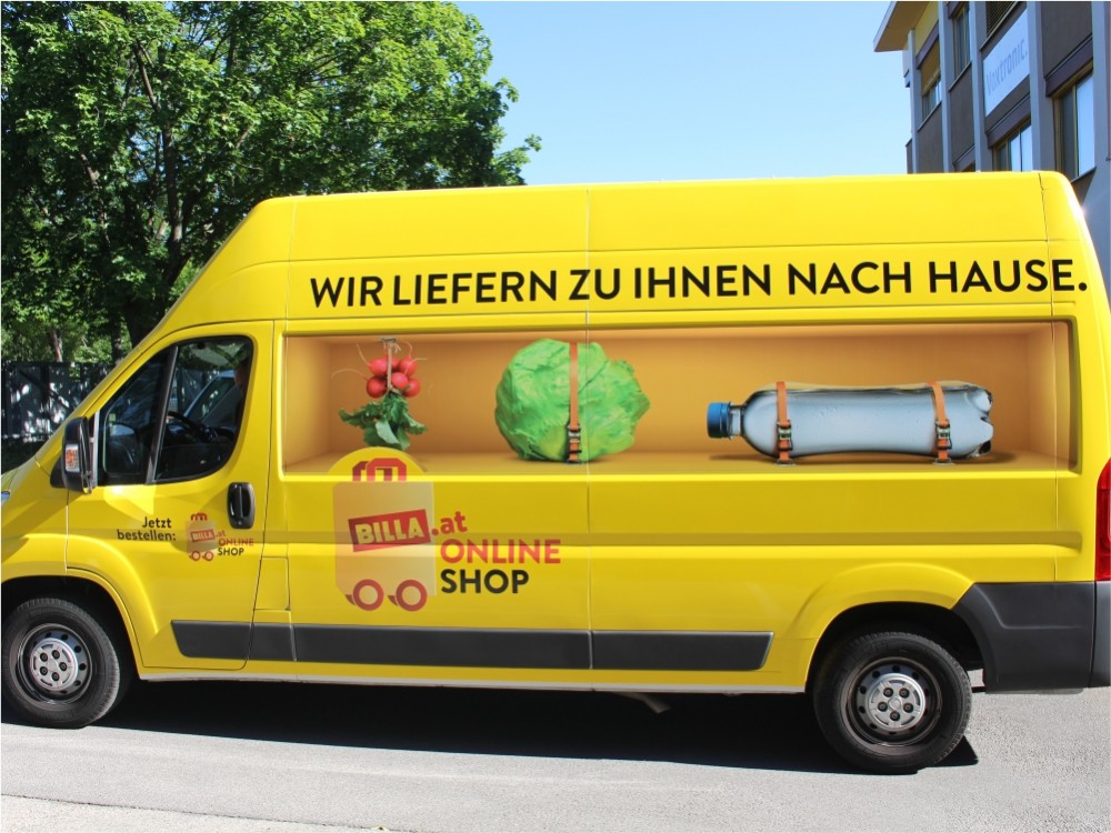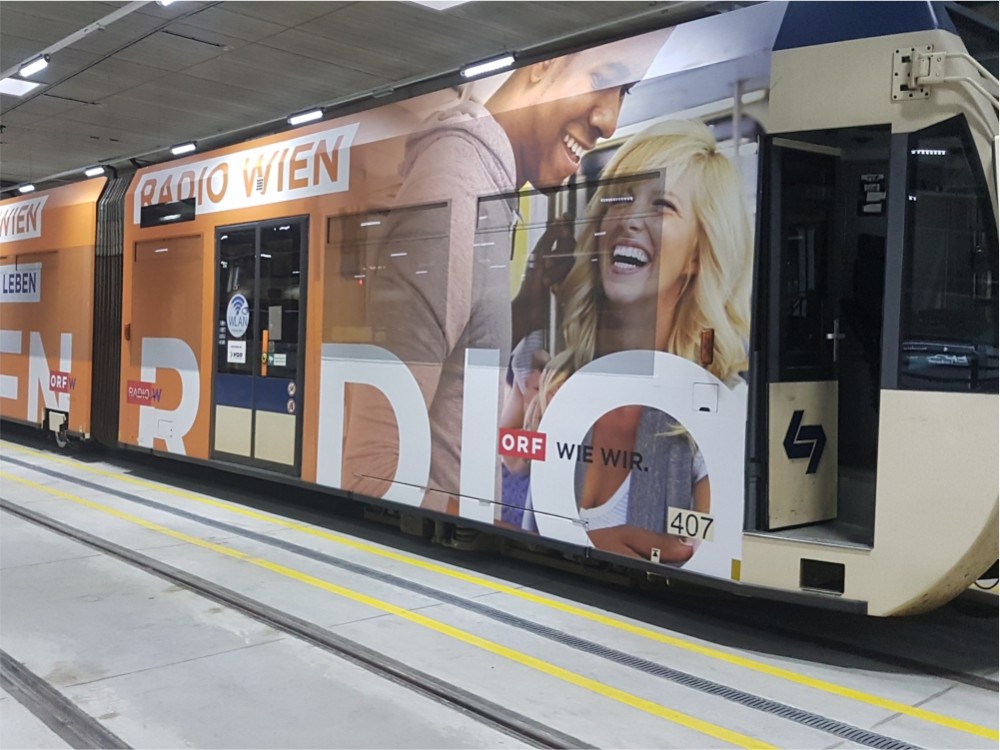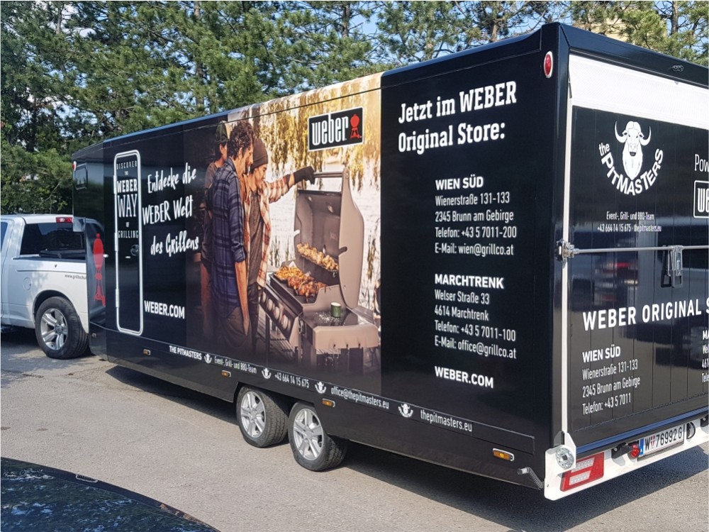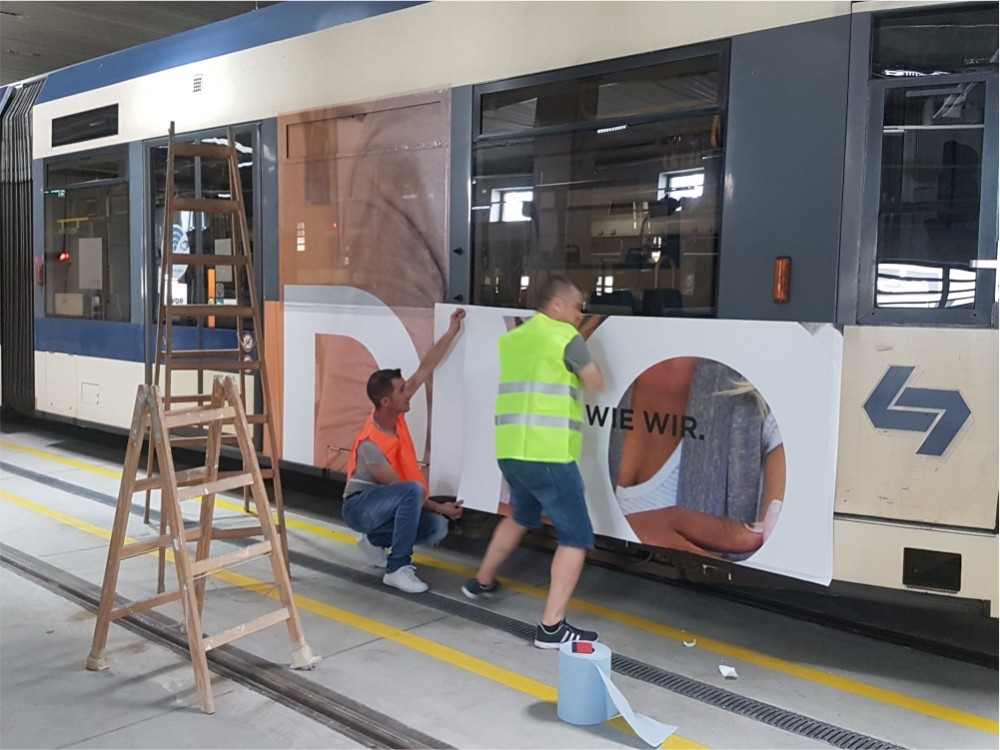 Großflächige Grafiken, Rückscheibenfolien, Werbetexte und auffällige Elemente.